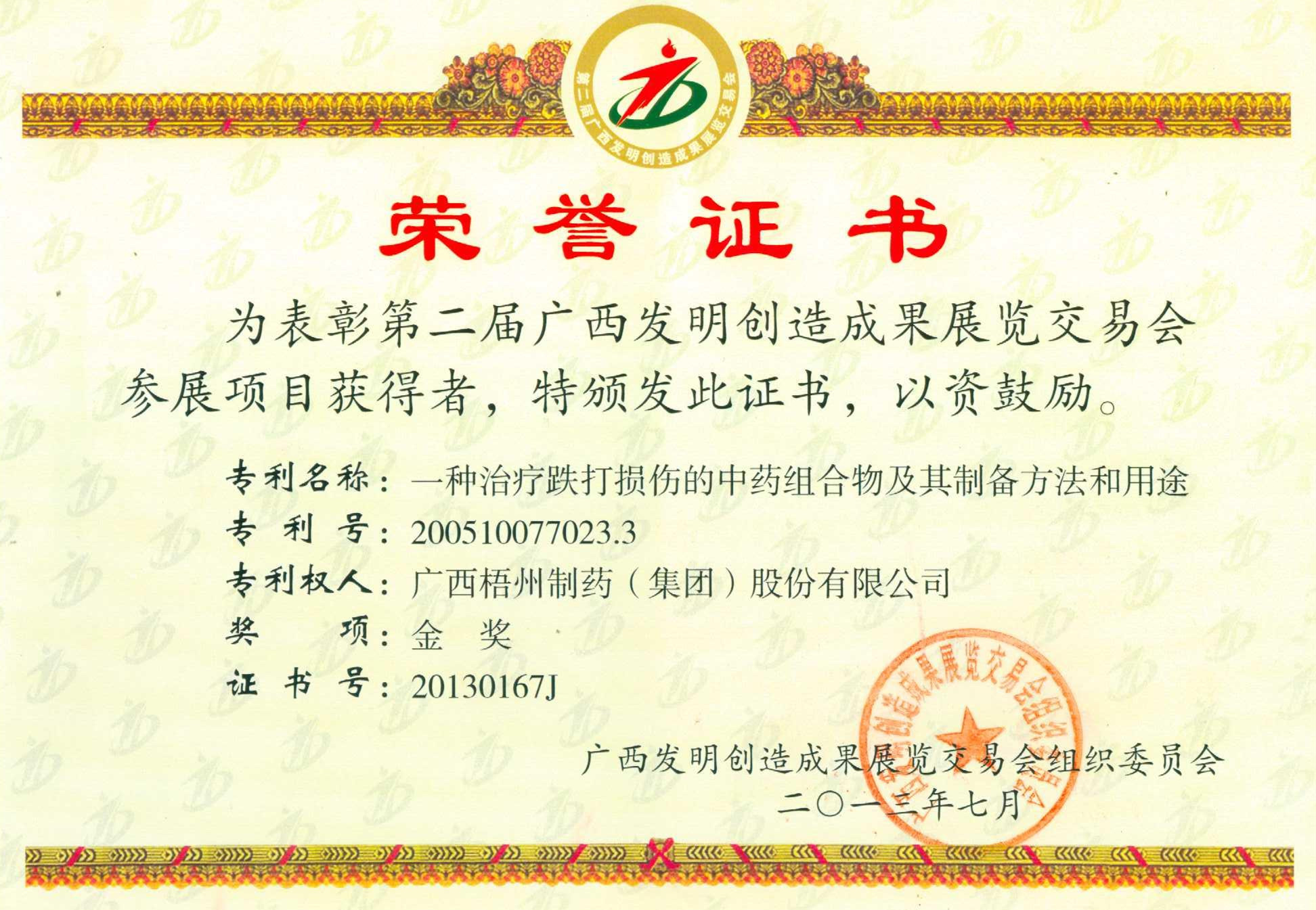 《一種治療跌打損傷的中藥組合物及其制備方法和用途》專利榮獲廣西發(fā)明創(chuàng)造成果展覽交易會(huì)參展項(xiàng)目金獎(jiǎng)