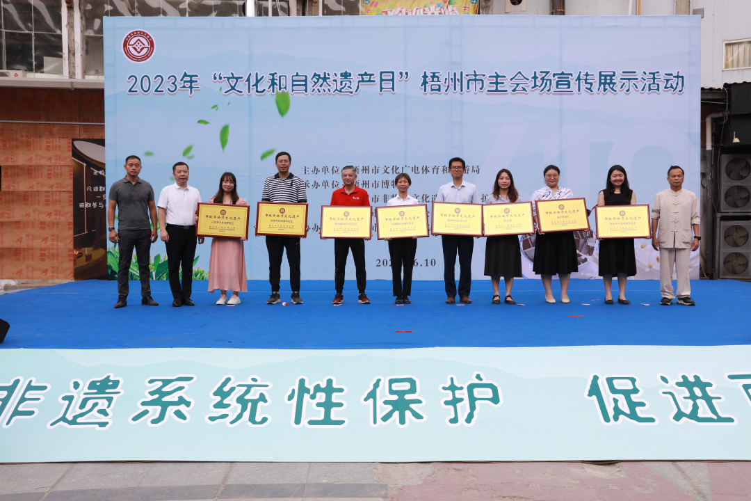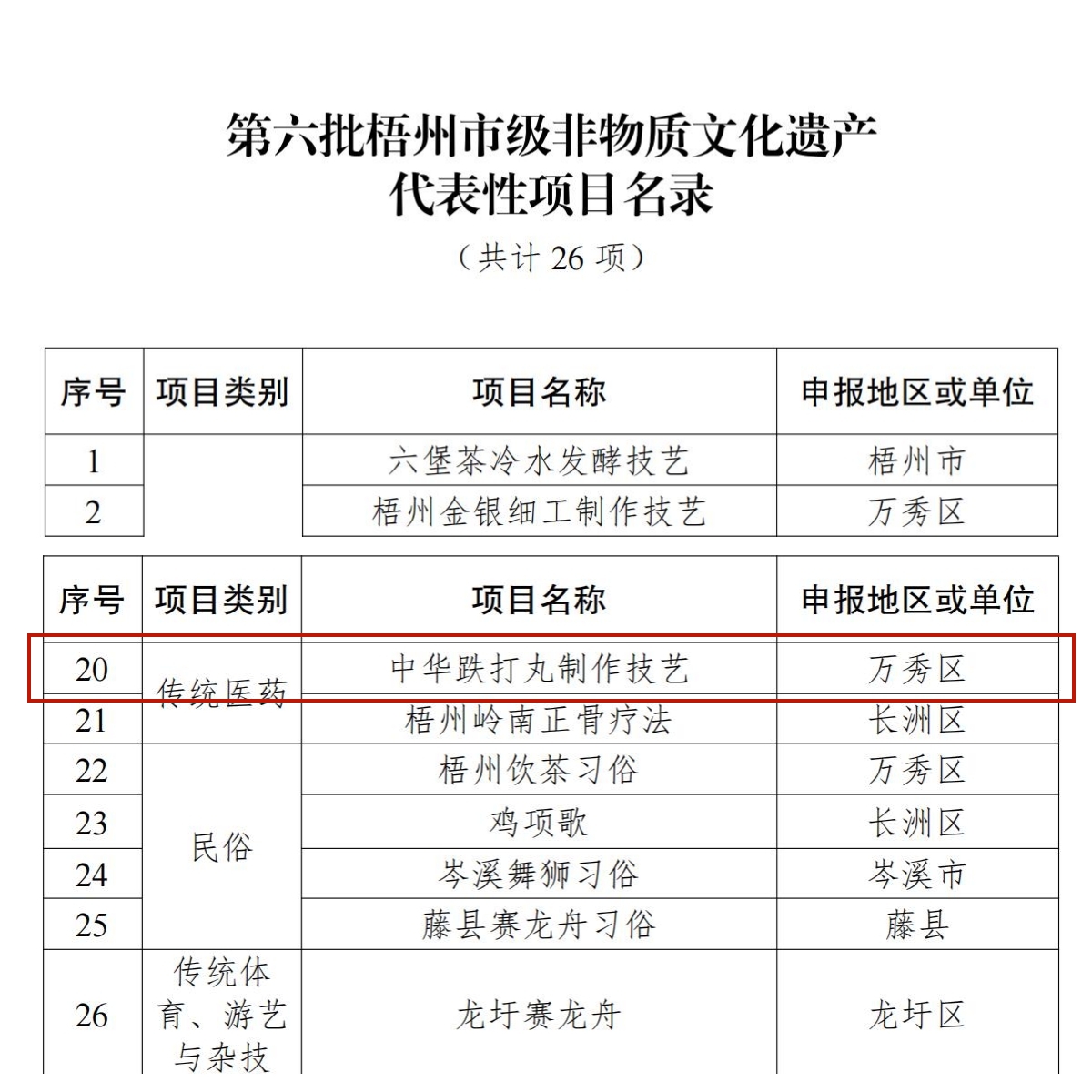 近日,在梧州市文化廣電體育和旅游局主辦的2023年“文化和自然遺產(chǎn)日”梧州市主會(huì)場宣傳展示活動(dòng)中,梧州制藥中華跌打丸制作技藝獲授牌匾,成功入選梧州市第六批非物質(zhì)文化遺產(chǎn)代表性項(xiàng)目名錄。
