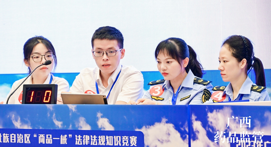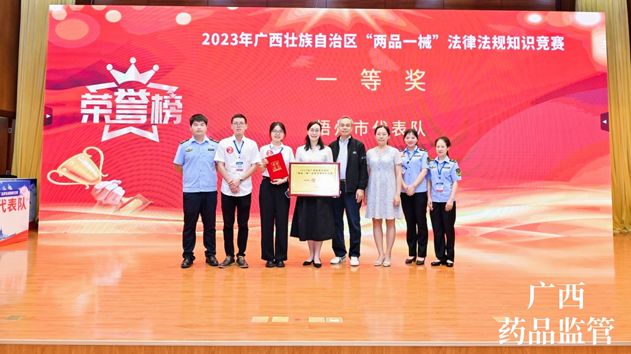 7月13日,由梧州制藥員工代表——質(zhì)量控制部呂金慧、質(zhì)量保證部李佳霖與梧州市場監(jiān)督管理局監(jiān)管人員組成的梧州市代表隊參加廣西壯族自治區(qū)“兩品一械”法律法規(guī)知識競賽,憑借過硬的專業(yè)知識、迅速的反應(yīng)能力、高效的團隊配合力,與全區(qū)14個市代表隊展開激烈角逐,榮獲得2023年廣西壯族自治區(qū)“兩品一械”法律法規(guī)知識競賽一等獎。