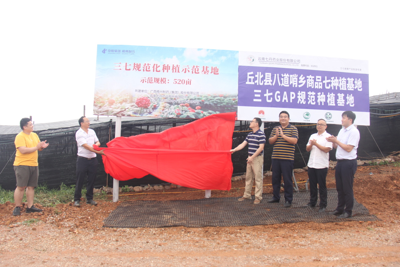 在簽約儀式前,梧州制藥副總經(jīng)理麥志雄與中恒中藥材公司總經(jīng)理胡冰等一行,深入位于云南文山州的520畝示范基地實(shí)地考察,共同為該基地揭牌。