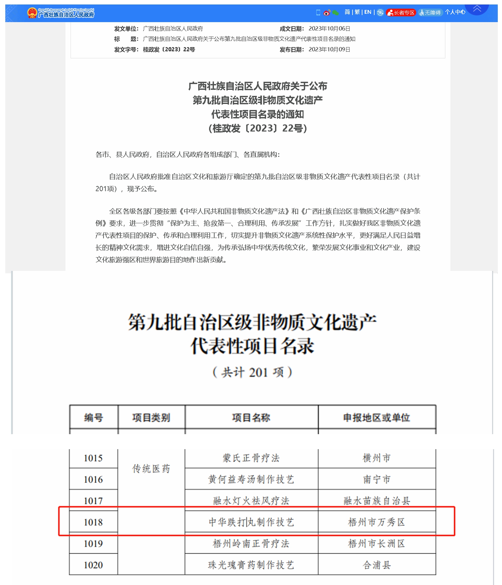 近日,廣西壯族自治區(qū)人民政府公布了第九批自治區(qū)級非物質(zhì)文化遺產(chǎn)代表性項目名錄,梧州制藥申報的中華跌打丸制作技藝成功入選,榜上有名。