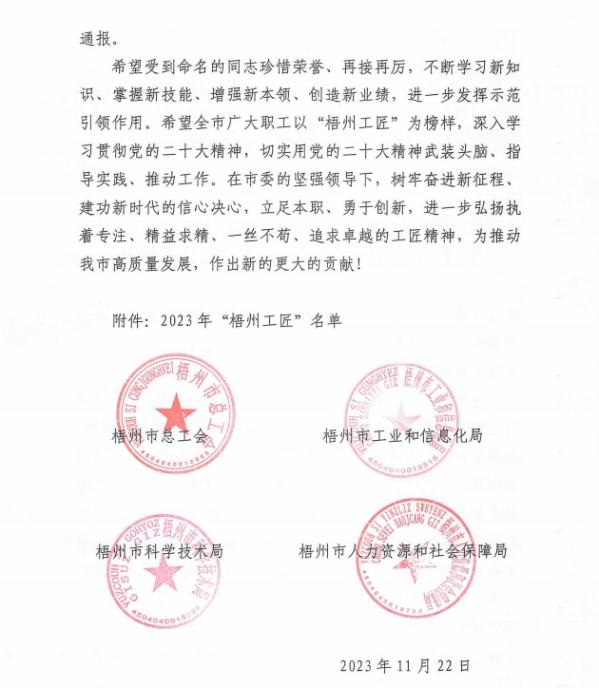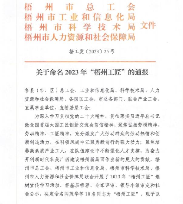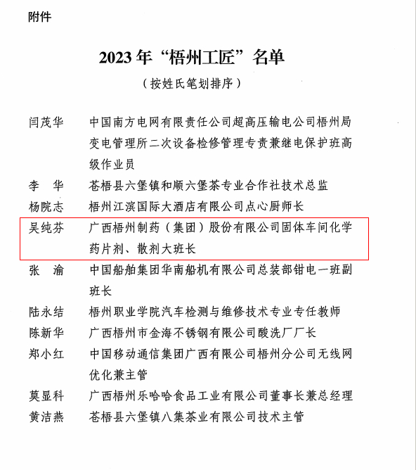 近日,梧州市總工會(huì)、梧州市工業(yè)和信息化局、梧州市科學(xué)技術(shù)局、梧州市人力資源和社會(huì)保障局聯(lián)合發(fā)布《關(guān)于命名2023年“梧州工匠”的通報(bào)》,梧州市有10名同志被選樹(shù)為“梧州工匠”,其中,梧州制藥固體車間化吳純芬獲此殊榮。