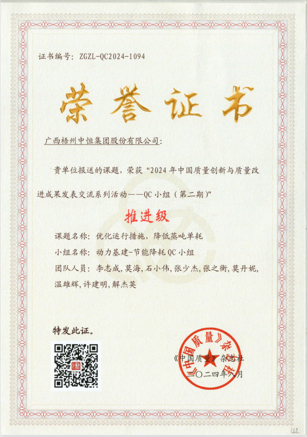 近日,梧州制藥動力基建車間的《優(yōu)化運行措施,降低蒸噸單耗》項目成果在2024年全國QC小組成果發(fā)表交流活動中,獲“推進級”成果稱號。