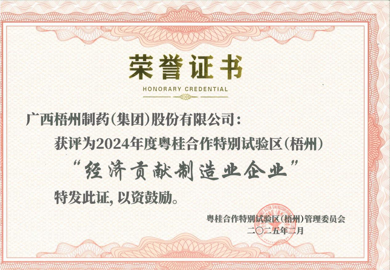 近日,粵桂合作特別試驗(yàn)區(qū)(梧州)2025年茶話會(huì)隆重舉行。茶話會(huì)上,粵桂合作特別試驗(yàn)區(qū)(梧州)管理委員會(huì)對(duì)2024年度園區(qū)內(nèi)的優(yōu)秀企業(yè)進(jìn)行表彰,梧州制藥憑借在制造業(yè)領(lǐng)域的卓越表現(xiàn)和突出貢獻(xiàn),榮獲“2024年度粵桂合作特別試驗(yàn)區(qū)(梧州)十大經(jīng)濟(jì)貢獻(xiàn)制造業(yè)企業(yè)”稱號(hào)。