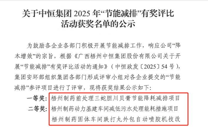 近日,在中恒集團(tuán)“節(jié)能減排”2025年有獎評比活動中,梧州制藥多項目脫穎而出,包攬一、二、三等獎。其中,前處理車間三蛇膽川貝膏節(jié)能降耗減排項目獲一等獎;動力基建車間減低污水處理能耗措施項目、固體車間跌打丸外包自動噴膠機(jī)技改項目獲二等獎;原料藥車間熒光素鈉生產(chǎn)線反應(yīng)室通風(fēng)系統(tǒng)及地面整改項目、液體車間減排綜合項目獲三等獎。
