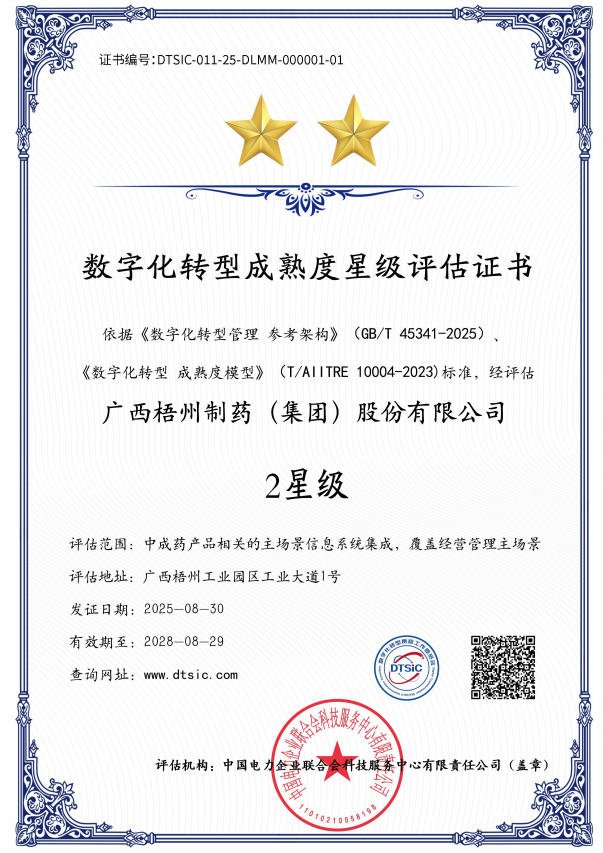 近日,數字化轉型貫標工作委員會公布第十九批數字化轉型貫標星級評估結果,廣西梧州制藥(集團)股份有限公司憑借扎實的轉型實踐與顯著成效,成功獲評數字化轉型成熟度2星級認證,成為中醫(yī)藥行業(yè)數字化轉型進程中的優(yōu)秀代表。該榮譽不僅是對企業(yè)過往轉型工作的權威認可,更為行業(yè)同仁推進數字化轉型提供了可參考的實踐路徑。