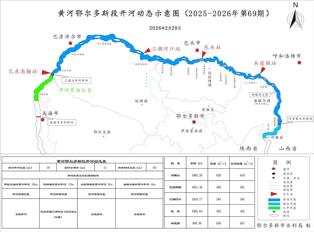 2月20日,黃河鄂爾多斯段累計(jì)開河長度39公里,較昨日增加12公里,剩余封凍長度591公里。